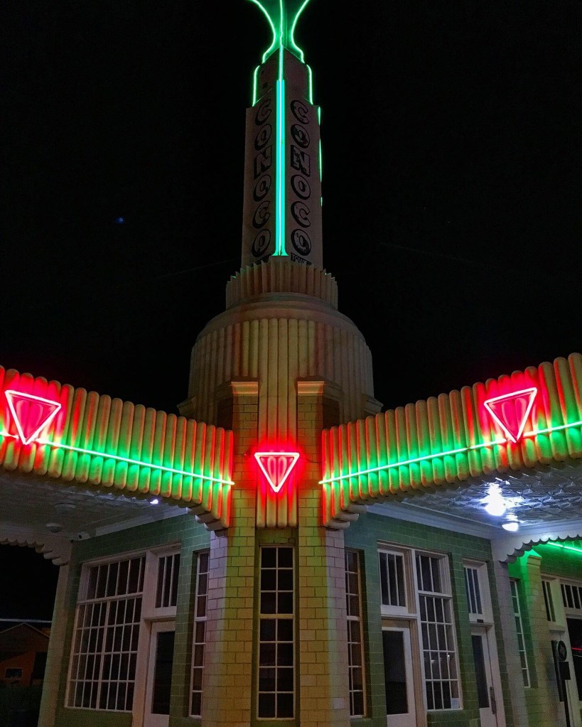 The volunteer working in the Conaco Station museum tipped us off that the place is particularly pretty at night as it’s original neon has been restored. At dark, we drove back from camp to check it out and she was right, it was spectacular!